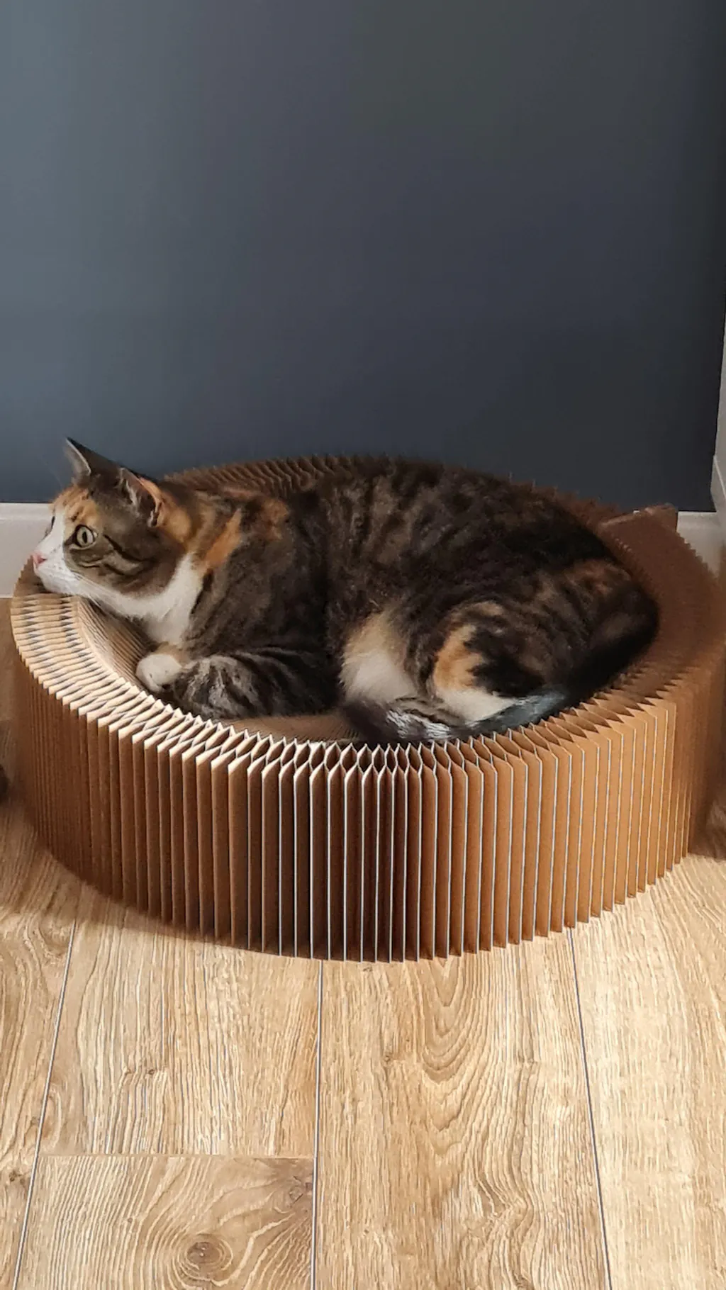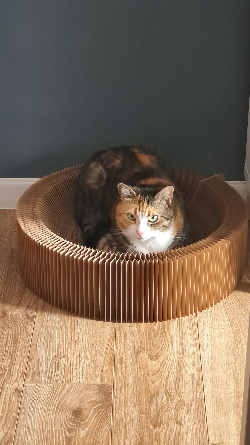 Okrągłe legowisko kartonowe dla kotów. Legowisko można łatwo złożyć i zabrać ze sobą, np. na wyjazd. Wykonane z tektury, czyli tego, co koty lubią najbardziej!
